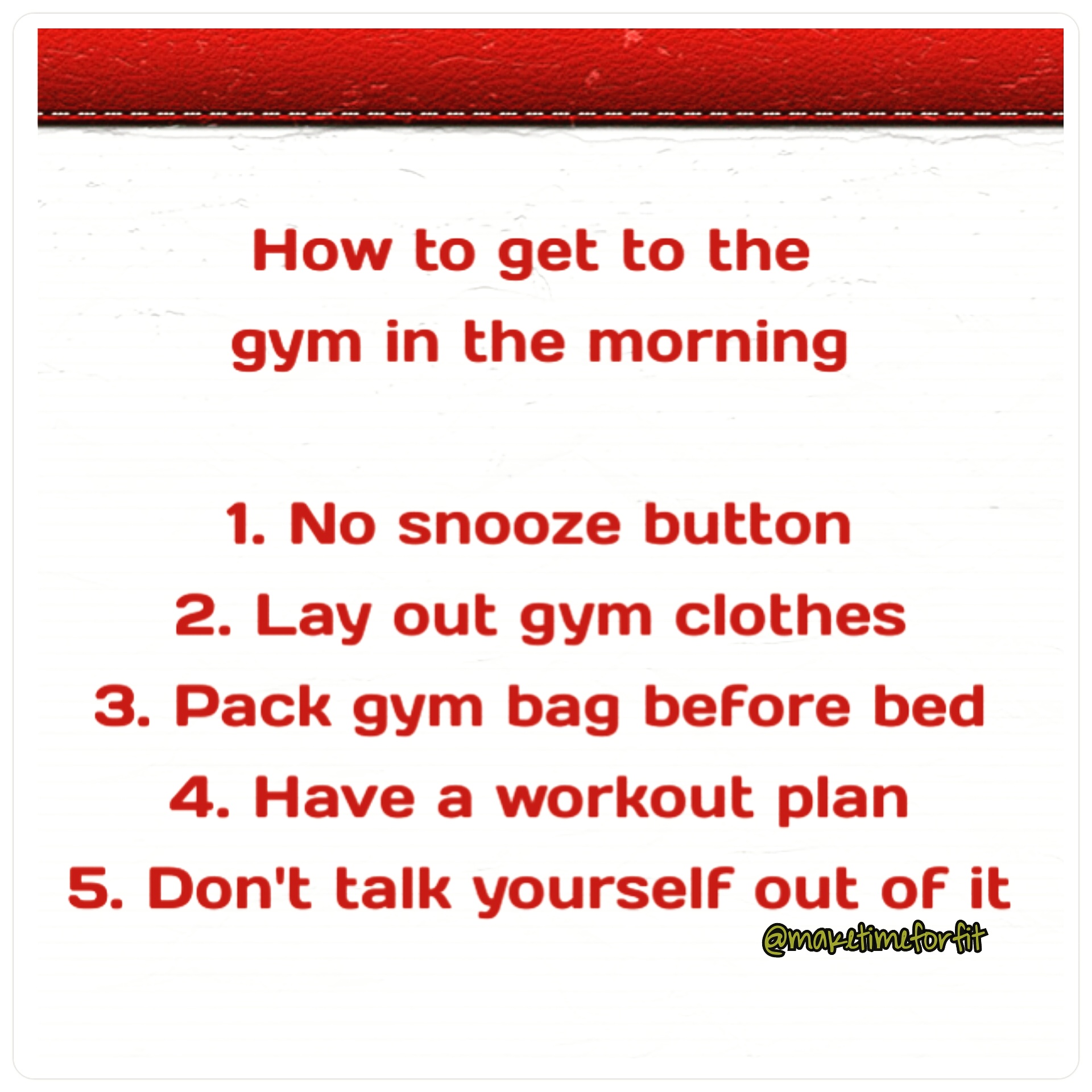 Get out of bed when your alarm goes off the first time. When you hit snooze you may delay just enough to talk yourself into skipping the gym.